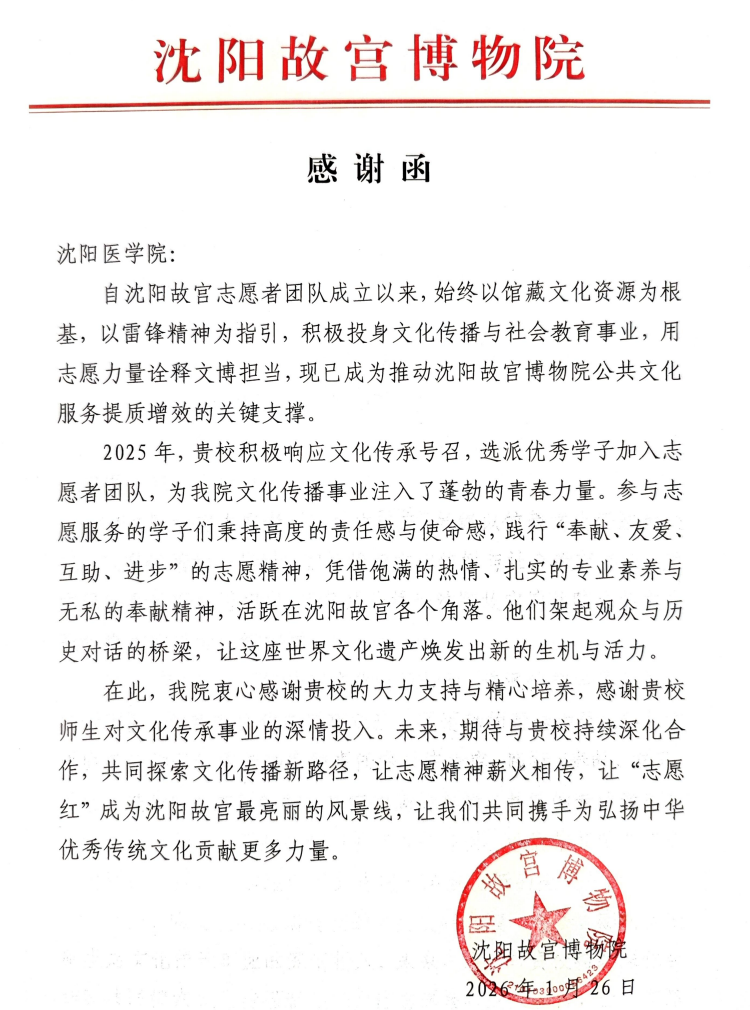 在中华优秀传统文化传承的生动实践中,沈阳医学院 “沈小青” 们的青春身影格外亮眼。他们以志愿之名,赴文化之约,用专业与热忱为沈阳故宫博物院注入蓬勃力量...