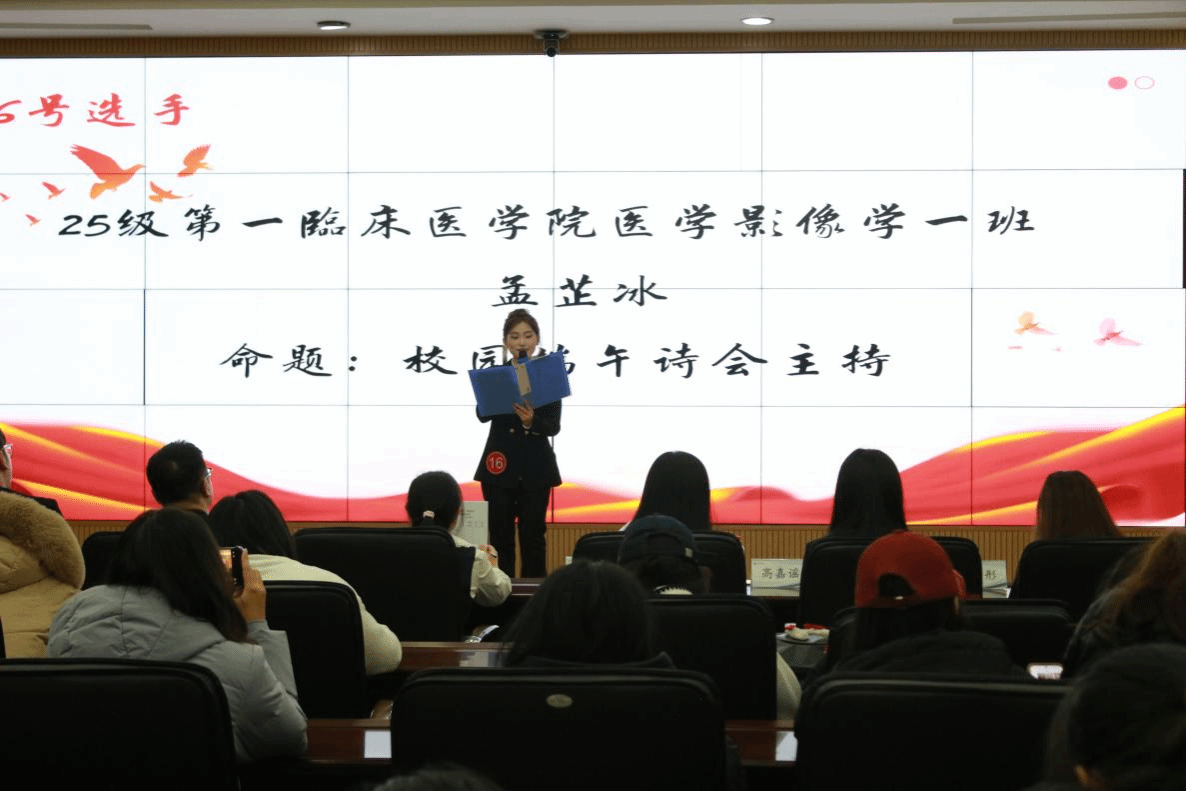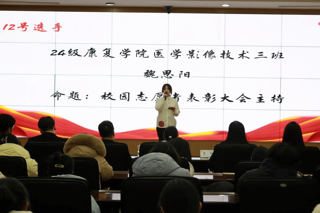 为丰富校园文化生活,营造积极向上的文化氛围,展现我校学子朝气蓬勃、富有活力的青春风采,提升大学生的语言表达、逻辑思维与临场应变能力,近日,沈阳医学院“‘主’宰青春,‘持’声而动”主持人大赛决赛在学校致远楼第一会议室顺利举行。校团委老师及各校级学生组织主席团成员出席活动并担任评委。