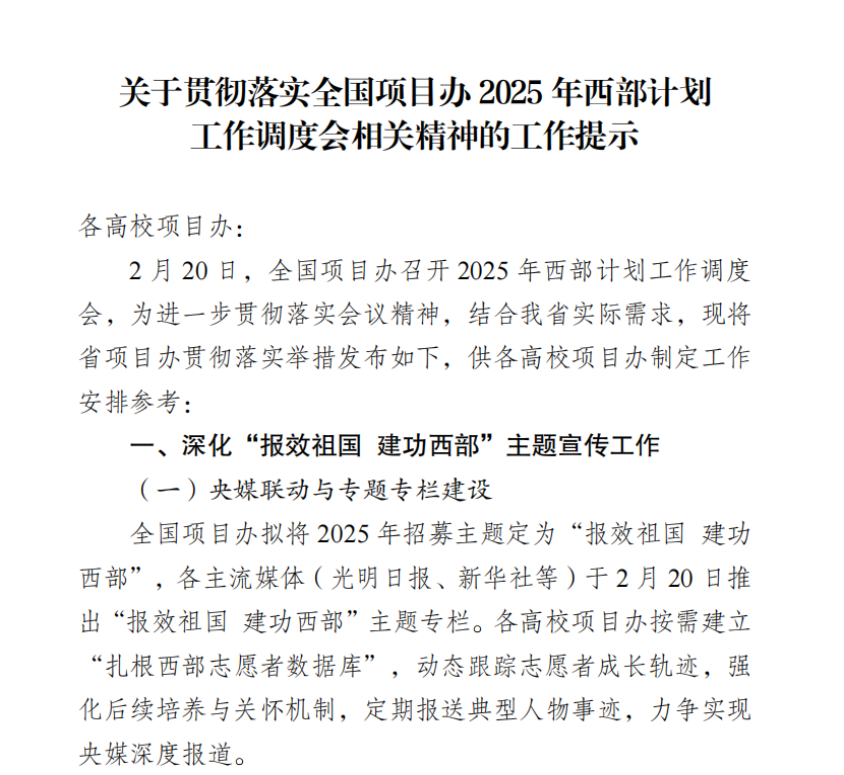 后续工作中,学校于6月对接上级及新疆项目办,结合学生意见与实际情况完成岗位分配;7月协助录取同学顺利报道。期间,学校还建立2025年西部计划交流群方便沟通,并安排专业人员作为负责人提供咨询服务,保障各项工作衔接顺畅。