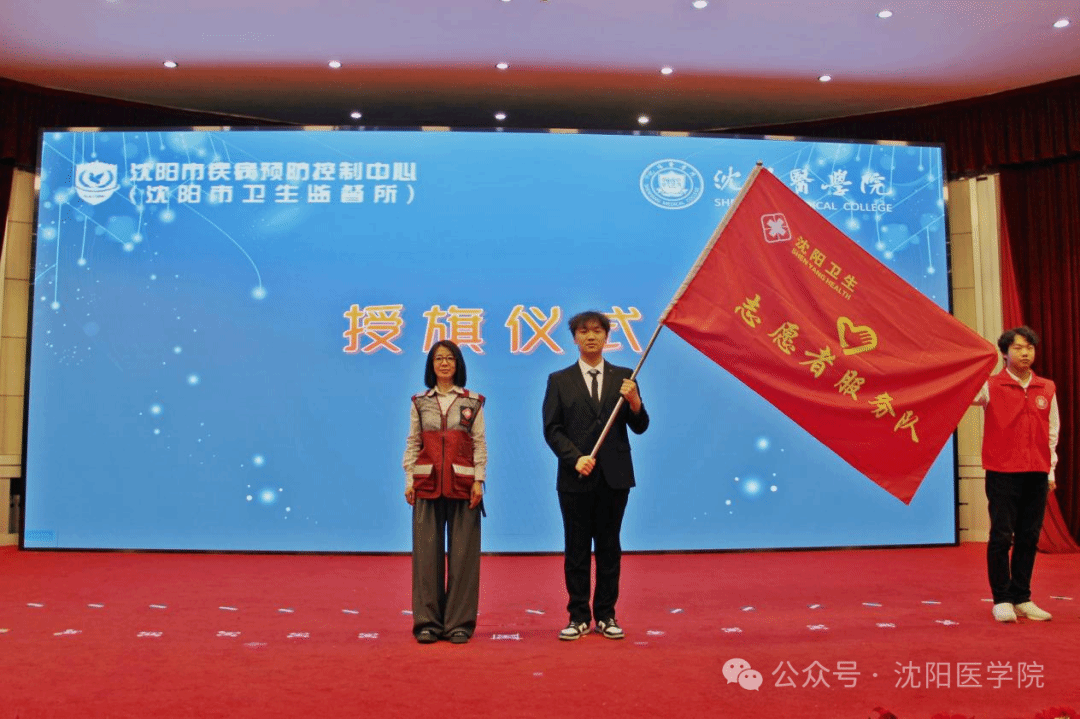 市卫生健康委监测预警与应急处置处亚云珠处长向我校志愿者团队授予“沈阳医学院抗疫志愿服务队”队旗。这面旗帜承载着应急使命与志愿荣光,象征着“奉献、友爱、互助、进步” 的志愿精神在代际间传承与弘扬,激励着志愿者们以饱满的热情投入到卫生应急志愿服务中。