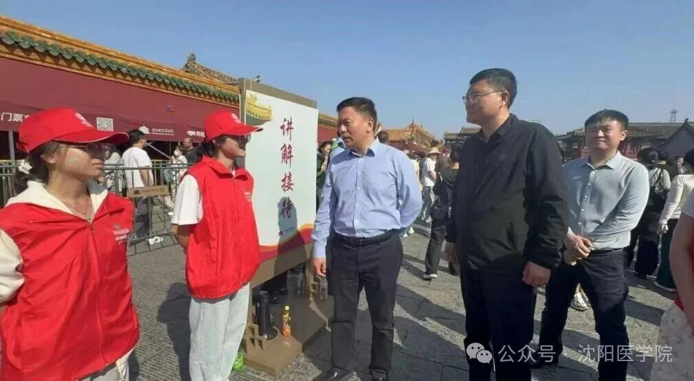 在志愿者服务岗位上,看望志愿者的领导们细致察看志愿服务流程,详细询问活动组织情况,并就服务细节与优化方向提出意见。期间,大家与志愿者亲切交流,了解志愿服务开展是否顺畅、游客对服务质量的反馈如何、志愿者工作保障是否落实到位等问题。看到志愿者们有条不紊地疏导游客人流、耐心细致地提供路线指引,大家对沈医志愿者始终践行“奉献、友爱、互助、进步”的志愿精神给予高度肯定。