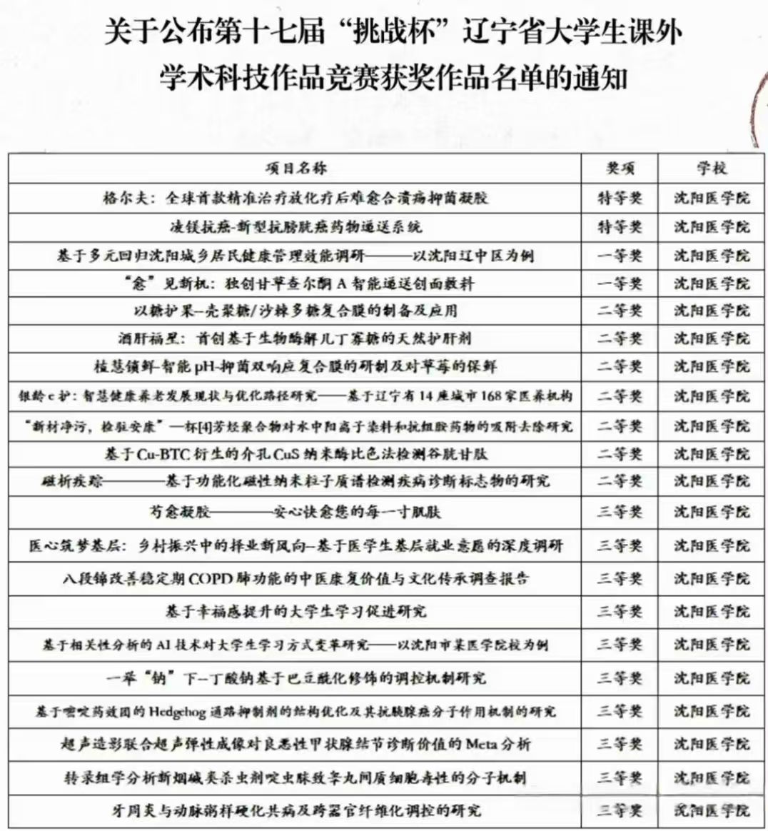 作为全国大学生科创领域的“奥林匹克”赛事,“挑战杯” 是检验高校创新人才培养质量的核心平台。本届辽宁省赛竞争尤为激烈,吸引全省95所高校、20万余名学生参与角逐。最终,我校参赛团队夺得特等奖2项、一等奖2项、二等奖7项、三等奖10项。其中,2项特等奖《格尔夫:全球首款精准治疗放化疗后难愈合溃疡抑菌凝胶》与《凌镁抗癌——新型抗膀胱癌药物递送系统》推荐参加国赛。