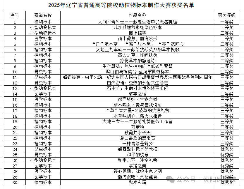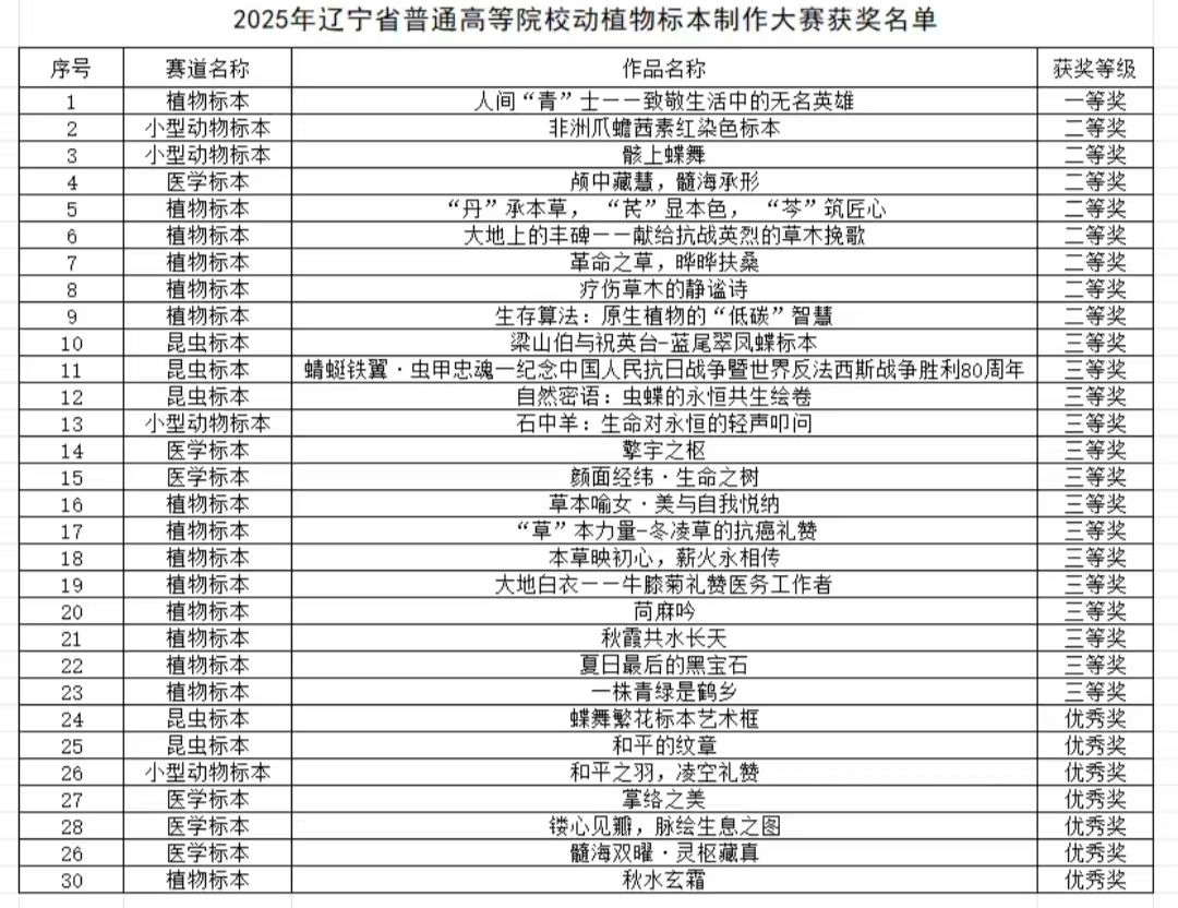 近日,在2025年辽宁省普通高等院校动植物标本制作大赛中,我校荣获一等奖1项、二等奖8项、三等奖14项、优秀奖7项。此次获奖总数以及各等次奖项数量均创学校参加此项比赛的历史新高,也是学校近年来高度重视实践教学,持续深化学生创新能力培养的有力体现。